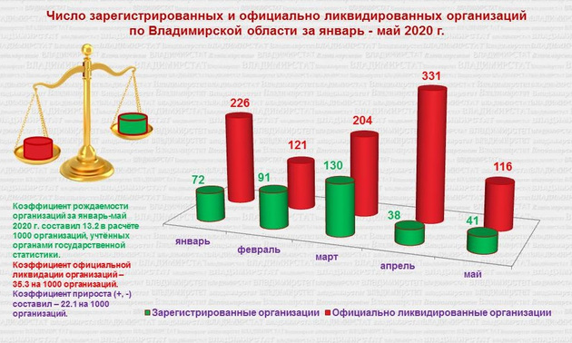 Владимирстат на днях обнародовал демографию предприятий за январь-май 2020 года. По расчетам ведомства, коэффициент рождаемости организаций в нашем регионе за пять месяцев равен 13,2 в расчете на 1000 организаций. А коэффициент официальной ликвидации за тот же период - 35,3 на 1000 организаций. То есть минус 22 организации в расчете на каждую тысячу. Год назад этот показатель был минус 8,3 — то есть так называемый «отрицательный прирост» был куда скромнее.