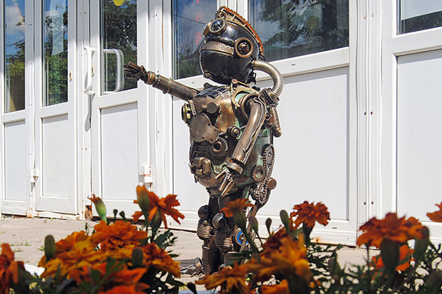 Необычная конструкция привлекает внимание горожан. Композиция сделана из металлических деталей. Автор работы - горожанин Владимир Чернышев. Он называет стиль своих творений как ресайклинг-арт. Это - искусство, основанное на превращении старых, отслуживших предметов быта в новые арт-объекты.