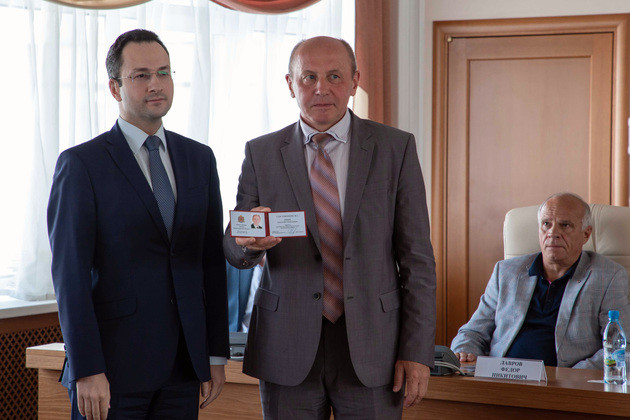 А затем Аркадий Боцан-Харченко торжественно вручил удостоверение новому председателю Общественной палаты области Анатолию Аннину.