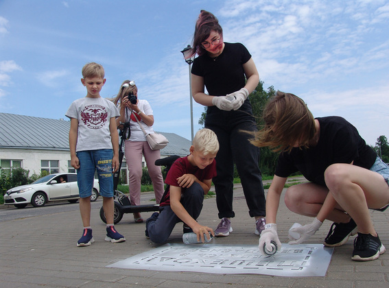 Госавтоинспекторы помогали девушкам, подсказывая, где лучше разместить надписи и всем проходящим пешеходам - взрослым и детям - напоминали ПДД.