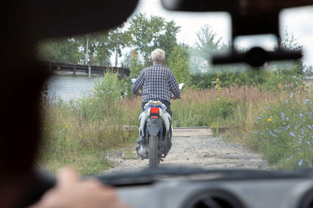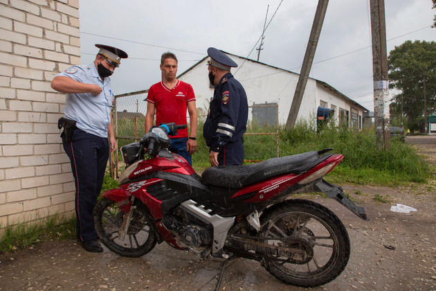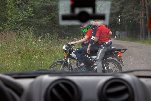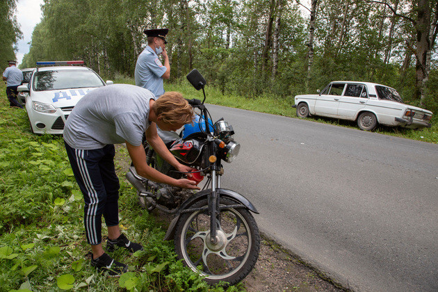 А вот за первым остановленным в Головино байком сразу «бинго»: местный 22-летний грузчик с мебельной фабрики, за спиной — подруга. Оба в шлемах, но у парнишки нет водительских прав, хотя водит мотоцикл он, по его же признанию, с 16 лет. «Но я в основном по проселочным дорогам! На работу только». Так, кстати, выступают многие мотоциклисты без прав и документов: мол, а что я сделал-то? В практике инспекторов даже был случай, когда нетрезвый водитель на «Урале» без шлема и документов на голубом глазу заявил им: «А я вообще стоял, а не ехал!» Это в то время, как его мотопробег засняли три видеокамеры. Когда он этот факт осознал, то изменил версию: «Да ладно вам! Я же просто в лес за грибами!» .