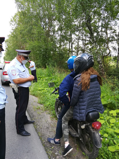 Кстати, мигание фарами помешало нашей группе пообщаться с первыми из увиденных в поселке Головино нарушителей. Пока машины с символикой на подъезде к поселку ждали сигнала, «гражданский» автомобиль заехал в центр — и тут же обнаружил двух подростков на мопеде. Оба были без шлемов и, видимо, без прав. Ехали как раз в сторону патрулей. И - местного магазина. Экипаж под прикрытием аккуратно «вел» их — и вот тут-то одна из местных машин, заехавших в поселок, посигналила мальчишкам о близости нарядов ДПС. Те тут же свернули в проулок, а затем — удрали по лесной тропинке, куда не мог вписаться ни один автомобиль. Интересно, понимает ли тот, кто сигналил, что оказал пацанам медвежью услугу? Если они будут ездить так же, наплевав на правила, исход очевиден...