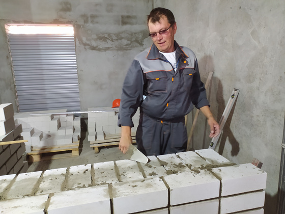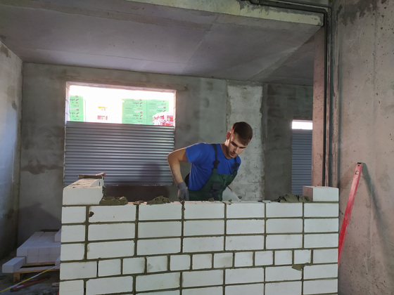 На конкурсе надо было сделать угловую кладку из кирпича. Стеновая кладка – 1,5 метра, перегородочная – 1,6 метра. Она станет основой будущей комнаты. Членами жюри учитывались прочность, красота и аккуратность.