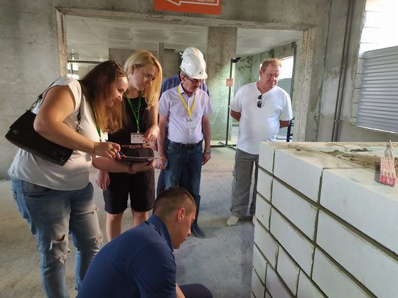 Раствор и воду им предоставили организаторы, а вот инструменты они привезли с собой свои. У каждой - мастерок, сокол, полутерок, уровень.