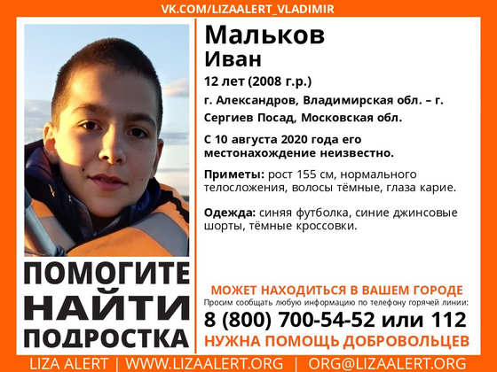 Сотрудники полиции совместно с волонтёрами областного поисково-спасательного отряда "Лиза Алерт" просят жителей Владимирской области оказать содействие в поисках 12-летнего Ивана Малькова из города Александров.