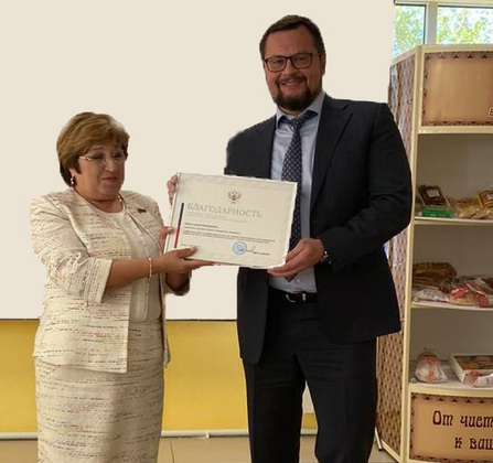 Сенатор от Владимирской области Ольга Хохлова в ходе своего визита в Вязники вручила благодарность Совета Федерации и передала теплые пожелания от Валентины Матвиенко управляющему АО «Владимирский хлебокомбинат» Алексею Лялину.