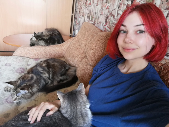 Обоих котов я выиграла на кошачьей выставке в лотерее. В 2018 году у меня появился Тор. Я ходила на выставку со своим молодым человеком, и из лотерейной бочки достали билет с его именем. Спустя два года мне снова повезло, только уже с моей одногруппницей Ксюшей Пискуновой. Она выиграла Теору, но отдала кошку мне. Для меня эта история — большая череда совпадений. Мейн-куна я хотела всегда. Когда я выиграла в первый раз, помню, как у меня дрожали колени, настолько это было неожиданно. Но я думаю, что мы с молодым человеком Тора «навизуализировали». Перед выставкой мы шутили, что вот выиграем кота, тогда тут поставим ему миску, а тут когтеточку, а тут он будет спать.