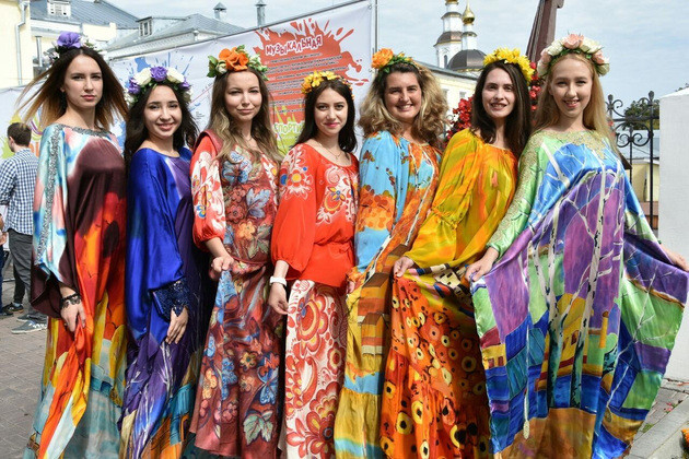 «Приложить свою руку» к общему делу можно и на другой площадке – творческой жёлтой. Вместе с остальными желающими мы раскрашивали шёлковый платок в технике батик. Эта точка была организована предприятиями народно-художественных промыслов России «Шёлковая коллекция», которая ещё и устроила показ мод.