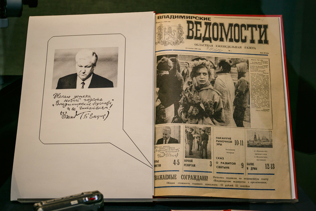Самый главный экспонат — первый номер газеты от 14 сентября 1990 года. С автографом Ельцина. Он пожелал успехов новой газете и ее читателям.
