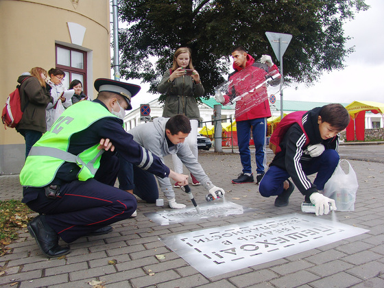 В июне нынешнего года здесь участники подобной акции нанесли на тротуары, а также на прилегающие к проезжей части территории у пешеходных переходов надписи: «Возьмите ребенка за руку», «Снимите наушники» и «Пешеход, убедись в безопасности». Таким образом они попытались привлечь внимание пешеходов к проблемам дорожно-транспортного травматизма и повысить уровень внимательности
