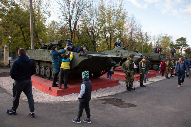 Парк действительно замечательный: с благоустроенными дорожками, новенькими скамейками, детскими и игровыми площадками, фонтаном и — мощной, брутальной экспозицией танков и военных бронемашин, предоставленных министерством обороны. При этом, как сказали Фомина и Зотов, в дальнейшем и экспозицию расширят, и парк продолжат благоустраивать — в рамках проекта «Формирование комфортной городской среды» нацпроекта «Жильё и городская среда».