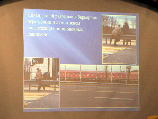 Один из слайдов из Гороховецкого района показывает, как пожилые женщины перелезают посреди трассы через отбойник, перекрывший разрыв для пешеходного перехода. Прямо «зебру» пополам перерезало!