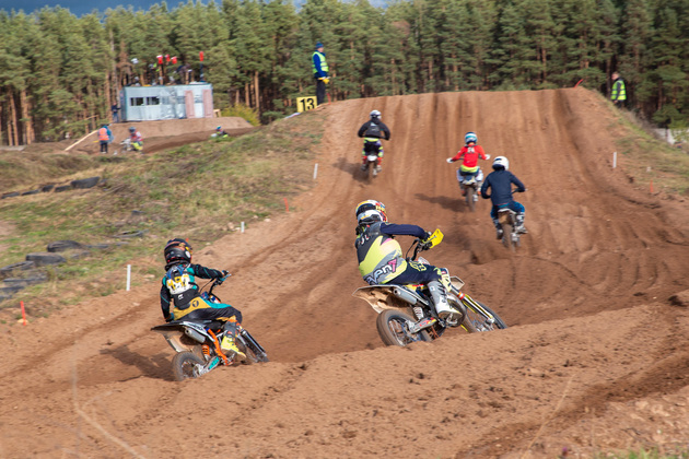На момент нашего приезда по трассе, жужжа моторами, мчались самые маленькие гонщики чемпионата — будто бы на игрушечных машинах с объемом двигателя на 65 кубов. Хотя все виражи, прыжки у них были точно того же плана, что и у более взрослых спортсменов. Но иногда складывалось полное впечатление, что — вот-вот, все столкнутся и посыплются, настолько близко некоторые мотоциклисты ехали друг к дружке. И, кстати, «в природе» есть мотоциклы еще меньше, чем у самых-самых юниоров: как ласково называют их профессионалы мотокросса, «на 50 кубиков». Именно эти «кубики» обычно становятся самыми первыми машинами делающих первые шажки в этом спорте 3-5-леток. Ковровский юниор — 13-летний Семен Рыбаков, так порадовавший губернатора своей победой, ездит на мотоцикле классом 86 кубических сантиметров.