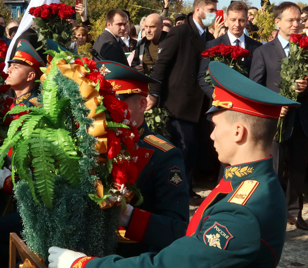 Играл духовой оркестр комендантского Преображенского полка, его солдаты и офицеры, одетые в форму трех родов войск Вооруженных Сил РФ, выстроились в шеренгу, мимо которой проехал кортеж участников церемонии. Они проследовали в восстановленную церковь Василия Великого, где митрополит Тихон отслужил молебен, и возложили цветы к памятнику павшим в годы Великой Отечественной войны.