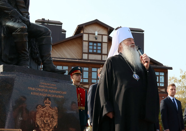 Митрополит Тихон окропил памятник святой водой и выступил с небольшой речью. Он сказал, что без прошлого нет будущего, и мы учимся у своих великих предков, как надо любить Родину. «Именно в этот день Суворов перешел через Альпы (с 10 по 27 сентября 1799 г. – ред.), – сказал Тихон, – и промыслом божьим именно в этот день мы его (памятник) освятим».