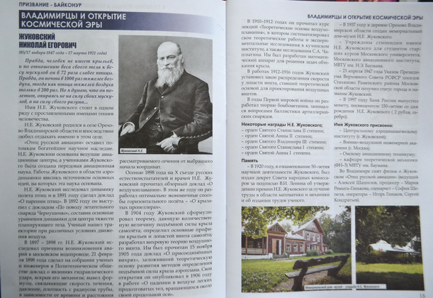 И недаром вторую книгу «Призвание - Байконур» Михаил Адамович снабдил подзаголовком «Вклад владимирцев в освоение космоса». Центральный раздел издания напоминает о наших великих земляках, обеспечивших дорогу в космос. А это Николай Жуковский, Анатолий Благонравов, Михаил Тихонравов, Николай Каманин, Игорь Яцунский. Яшуков заметил, что современная молодежь мало о них знает и постарался восполнить этот пробел. Рассказал и о Николае Луковникове из Мурома, участнике запусков ракеты «Протон».
