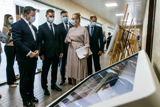 Перед началом заседания губернатор Владимир Сипягин, директор департамента культурв АВО Алиса Бирюкова и гендиректор РГБ Вадим Дуда осмотрели выставку, иллюстрирующую участие региона 33 в нацпроекте «Культура».
