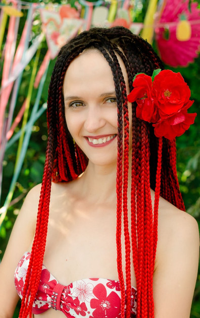 - Может, и так! Просто люблю быть разной и приносить людям радость! Перепробовала много разных причесок и разных цветов для волос. Креативные идеи в плане причесок обычно приходят в голову накануне тематических фотосессий. Так, несколько лет назад, я побрила половину головы и покрасила остальное в синий цвет, в стиле инопланетянки. Муж, к счастью, поддерживает мои идеи. Папа ездил как-то раз в Германию на серьезную конференцию по программированию и рассказал, что среди докладчиков был мужчина с ирокезом зеленого цвета. Нормально.