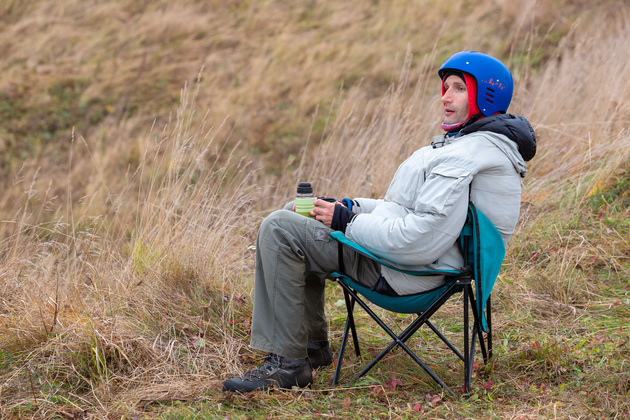 Пока мы разговаривали с Артемом, один из отлетавших все свои попытки участников прикрутил к крылу двигатель, взлетел и начал весело (трескотня двигателя вообще-то очень напоминает моторчик Карлсона из знаменитого советского мультфильма) в воздухе нарезать круги вокруг холма, где остальные спортсмены с разложенными крыльями в полной готовности как раз терпеливо ждали окончания затянувшегося штиля. «Жалко, ружья нет!» - дружно смеялись ребята.