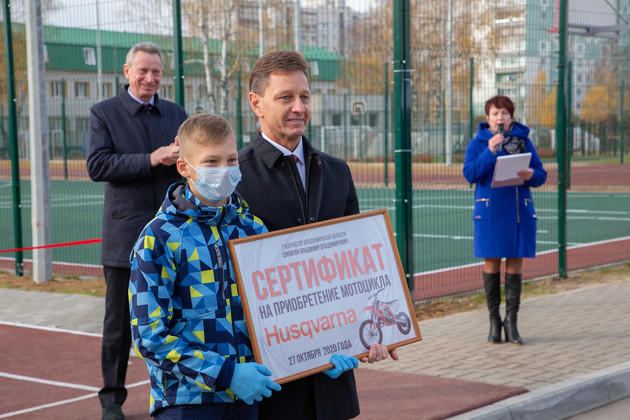 Также в ходе открытия нового спортивного комплекса прошло торжественное награждение победителя первенства России по мотокроссу в классе 85 кубических сантиметров, воспитанника Ковровской спортивной школы “Мотодром арена” Семёна Рыбакова. Юного чемпиона наградили сертификатом на приобретение нового мотокроссового мотоцикла, деньги на приз выделены из резервов администрации Владимирской области.