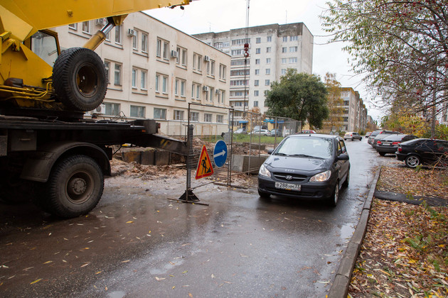 Встречный транспорт с трудом разъезжается. Безопасности это не добавляет. Помехи движению создают и машины, припаркованные у соседнего дома. С другой стороны - куда им деваться? Деятельность тут довольно интенсивная: работает кран, в ваннах – бетонный раствор. Идем к рабочим с вопросом: почему так долго и когда же конец?
