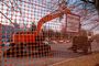 Действительно, ограждениями траншея отделена только от проезжей части. Металлическими барьерами отделены перешейки, оставленные для пешеходов. Правда, кое-где эти барьеры уже снесло ветром. Ну и от грязных луж эти барьеры, разумеется, не спасают.