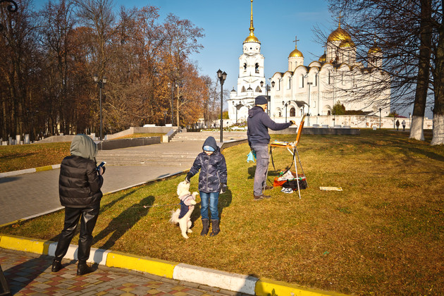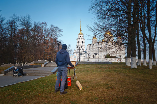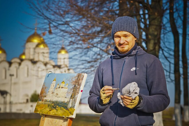 - В последнее время часто езжу в Суздаль. Сначала не понравилось, но так бывает. Всё зависит от вдохновения. Часто пишу в Мстёре. Там хорошо – солнышко светит, травка зеленеет, коровы пасутся, купола блестят. У нас очень много мест в области, я ещё не все объехал, но - планирую. Очень рад, что здесь живу. В ином месте, наверное, что-то было по-другому в моём творчестве. Но у нас, куда ни глянь, везде красиво. У меня было две командировки в Плёс. Очень понравилось, но там много туристов. Людям нравятся такие пейзажи: холмы, церкви, домики интересные. Можно жонглировать разными сюжетами. Был ещё в Питере, но там скучновато. Прекрасная архитектура, но меня не очень вдохновила. К тому же у них постоянно происходили какие-то ужасные события – здесь Павла І убили, тут Александра Ⅱ взорвали. Это давит. А недавно был на десяти дневном пленэре в Переславле-Залесском. Жили, кстати, в монастыре, в спартанских условиях. А хотел бы еще съездить на север, в Архангельскую область, где сугробы по окна. Пожить без интернета, без всего, там, где медведи ходят. В экстрим. И, кажется, у меня получится туда съездить. Настрой, знаете, такой: «Эх, как-то попсово. Надо что-нибудь посуровей - с медведями, с тайгой!». Я и вдохновение беру напрямую из природы – как увидел, так и передал. И каждый раз всё по-разному: могу начать с подмалёвка, а могу сразу перейти к фактуре из самого центра композиции. Кстати, в творчестве других художников больше всего вдохновляюсь Коровиным. Я бы хотел найти баланс между этими двумя гранями – психологичностью Левитана и свободой Коровина.