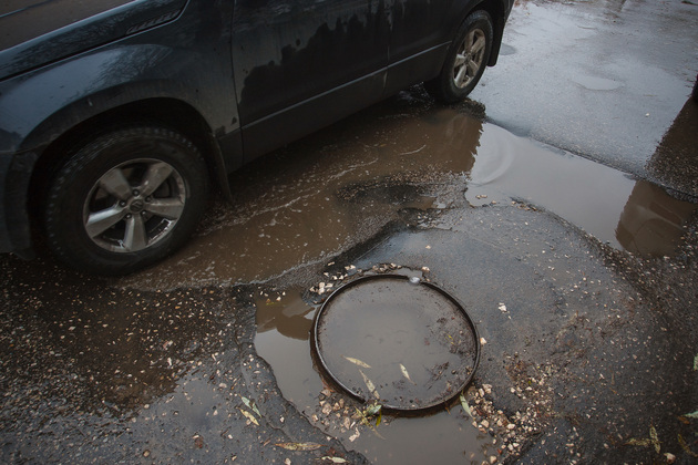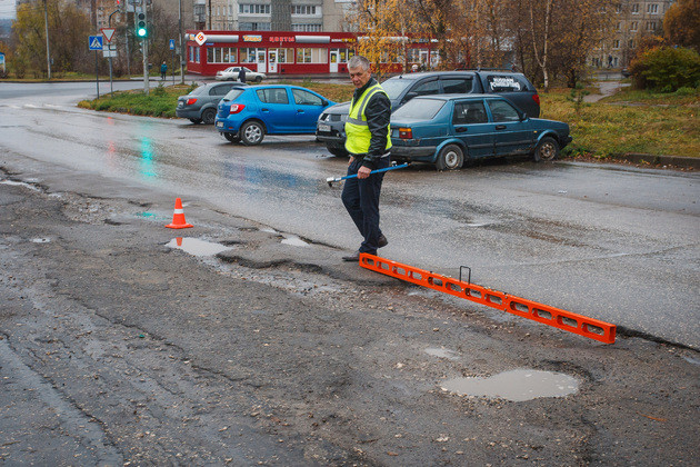Сергей Федяев со своей планкой все мерил и мерил ямы и что-то помечал в своем блокноте. Один раз он едва не по колено залез в разлившуюся как озеро лужищу, не щадя ни ботинок, ни аттестованного инструмента. А потом с огорчением сказал, что здесь не померишь: длины инструмента не хватает - для таких глубин он не предназначен. Он показывал на просевшие крышки люков и на уже свежие ямы, образовавшиеся на месте присыпки дороги асфальтовой крошкой...