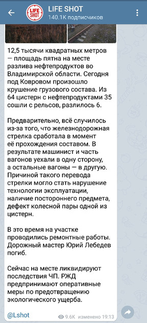 С рельсов сошли 35 из 54 грузовых вагонов с мазутом. Один человек погиб. Железнодорожник попал под упавшую цистерну. По факту его гибели возбуждено уголовное дело.