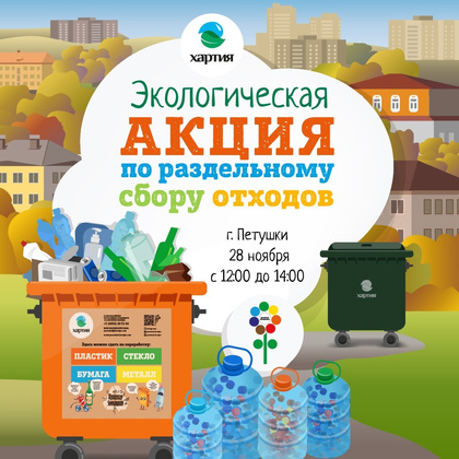 28 ноября 2020 года в городе Петушки вновь состоится акция по приему раздельно собранных отходов «Экогород». На Советской площади ООО «Хартия» организует сбор отходов, подлежащих переработке.
