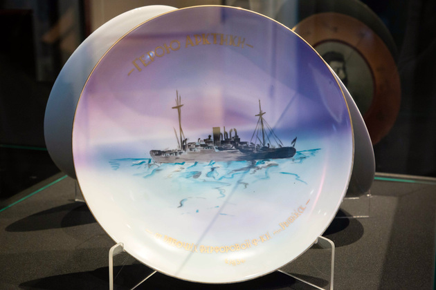 Среди художественной керамики - декоративное блюдо 1934 года с изображением теплохода «Челюскин», затертого во льдах Арктики, полученное на память нашим земляком Владимиром Задоровым, который был парторгом в команде «Челюскина».