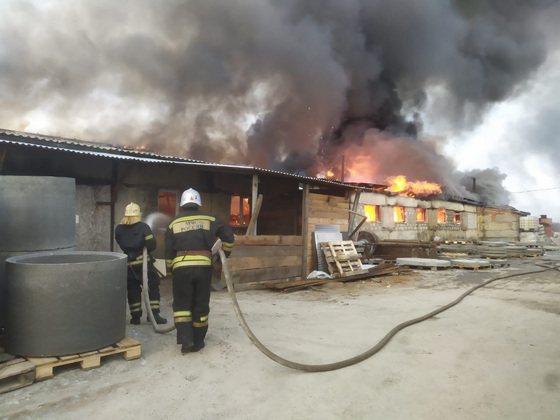 Обновление 15.00. По информации пресс-службы ГУ МЧС, возгорание произошло в цехе по производству бетонных колец и деревянных игрушек. Открытое горение ликвидировано в 12.20. Сгорели внутренняя отделка, имущество и кровля на общей площади 1000 кв.м. Распространение огня на соседние здания удалось не допустить.