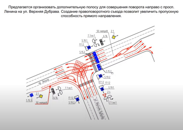 На повороте с проспекта Ленина на Верхнюю Дуброву намечена дополнительная полоса. При этом организация дополнительного «кармана» позволит увеличить пропускную способность магистрали вдоль проспекта Ленина в сторону Москвы.