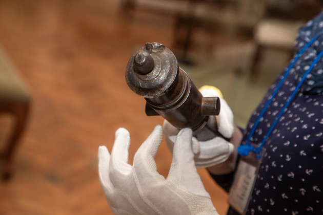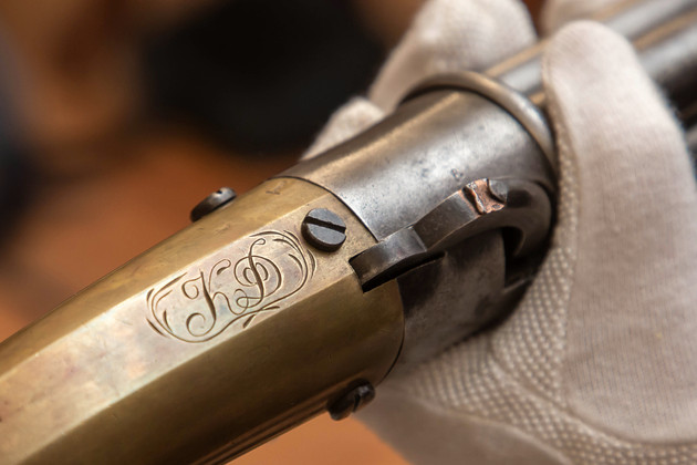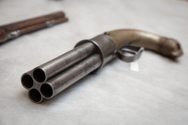 Часть экспонатов в музей передали из ЧК — Чрезвычайной комиссии по борьбе с контрреволюцией и саботажем. В основном это ружья дворян. Но чьи именно — мы вряд ли когда узнаем, грустит эксперт. Исключение — образчики, где владелец все же ставил на декоративных элементах свои вензеля. Как, например, на показанном нам четырехствольном бундель-револьвере.