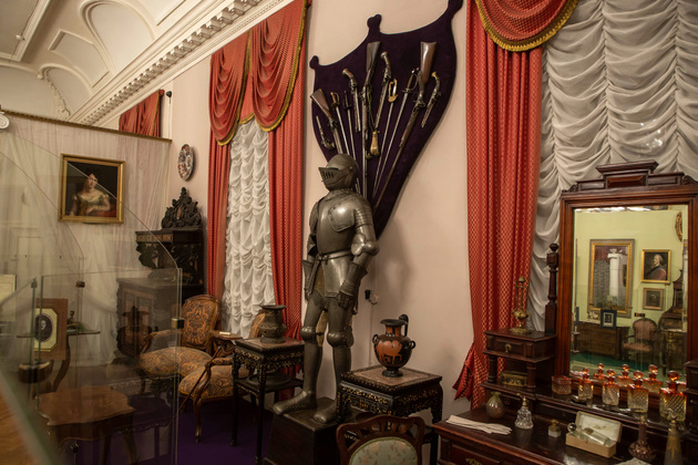 Самое большое собрание оружия досталось от Храповицкого – 62 предмета. При их реквизиции было указано, что со стен кабинета предводителя владимирского дворянства, отправившегося в эмиграцию, было снято шесть щитов со старинным оружием. По аналогии с этим щитами Храповицкого на выставке представление оружейных экспонатов оформили и современные музейщики. Как раз над декоративными доспехами рыцаря, которые аристократ заказал для своей курительной комнаты (это было модно).