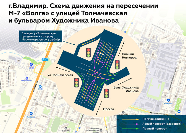 Те, кто двигается в сторону Нижнего Новгорода и намерены повернуть на улицу Толмачевская, должны будут занимать крайнюю левую накопительную полосу. По второй и третьей полосе (средним) движение осуществляется только в прямом направлении. Крайняя правая остается для съезда на бульвар художника Иванова.