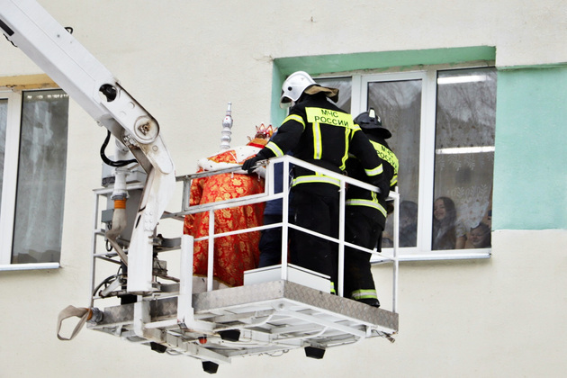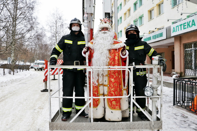 Накануне новогодних праздников маленьких пациентов Владимирской областной детской клинической больницы навестил Дед Мороз: сказочный гость поднялся к окнам медучреждения при помощи коленчатого подъемника и передал ребятишкам сладкие подарки.