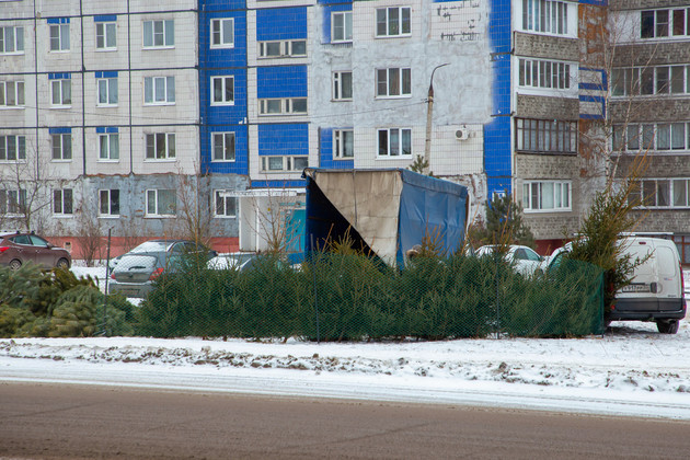 Едем смотреть, как разворачивается торговля на остальных владимирских елочных базарах. На проспекте Ленина по адресу, указанному в пресс-релизе мэрии, - тишина. На перекрестке Василисина и Верхней Дубровы мы застали так и не открывшийся базарчик за переездом.