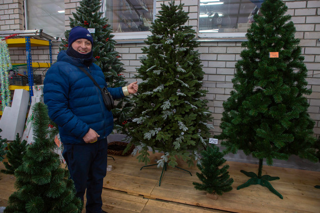 Сергей Фролов - сторонник искусственных елок. Впрочем, странно было бы от него услышать иное, раз он ими торгует. А помогает ему в работе забавный и дружелюбный джек-рассетерьер Гарри. Их торговое место украшено сияющими гирляндами, переливающимися шарами. Сразу видно – праздник на подходе. Проходящие по рынку покупатели говорят, что здесь можно и новогоднюю ночь встречать — так красиво и радостно. Но и сейчас покупателей, привлеченных праздничным убранством, тоже хватает, хотя Сергей говорит, что их стало меньше.
