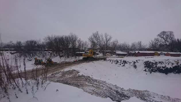 По дну котлована идут пешеходы – «первооткрыватели» будущего проезда. Рядом по дороге с трудом разъезжаются с самосвалами автомобили. С огромным трудом фуры пытается залезть в гору, шлифуя голый лед.