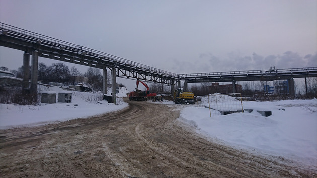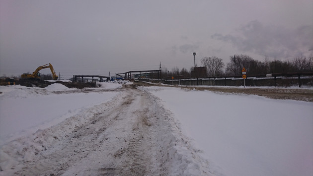 Линия магистрали прослеживается и ближе к реке (со стороны химического завода), куда прибывает спецтехника. Рабочие суетятся возле бурильной установки, рядом ухает еще одна.