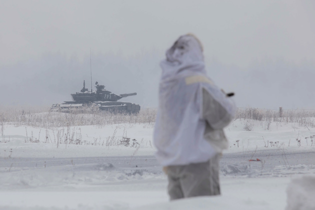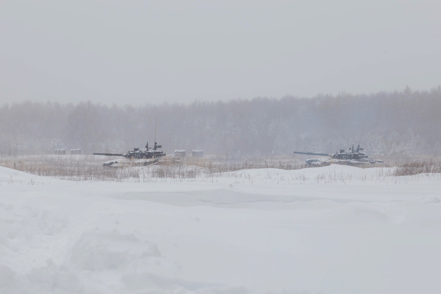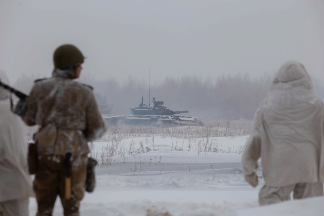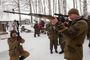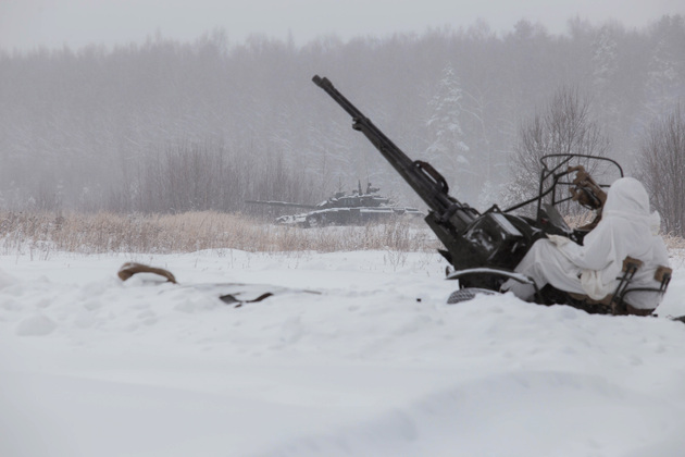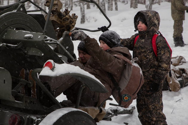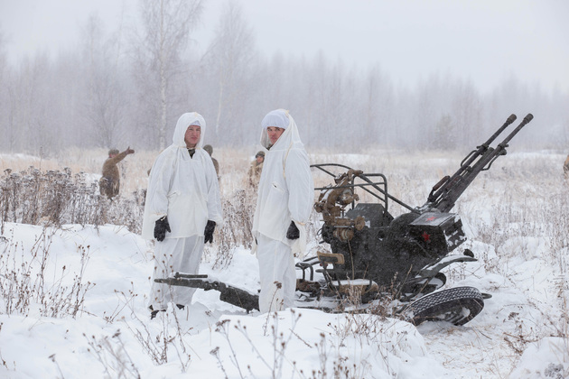 Кстати, кроме энтузиастов всех возрастов, в реконструкции участвовали несколько солдат-срочников, переодетых в красноармейцев. С двумя из них (оба — Андреи) мы познакомились, протоптавшись на их позицию по сугробам, у оберегаемого ребятами артиллерийского орудия. Один — нижегородец, второй — из Белгорода, но служат в Коврове. Оба парня - в белом камуфляже по уши - на полигоне находятся с девяти утра (а бой начинался в час). «Не закоченели?» - спрашиваем. «Нет», - отрицательно мотают головами. Сначала орудие собирали, потом — проверяли, так что некогда было мерзнуть. На вопрос «И стрелять из этой пушки будете?» со смехом ответили: «Конечно! Когда танки поедут». Тут мы сразу воспряли духом — так танки все-таки поедут! Не зря же ребят с девяти утра держали на позиции!