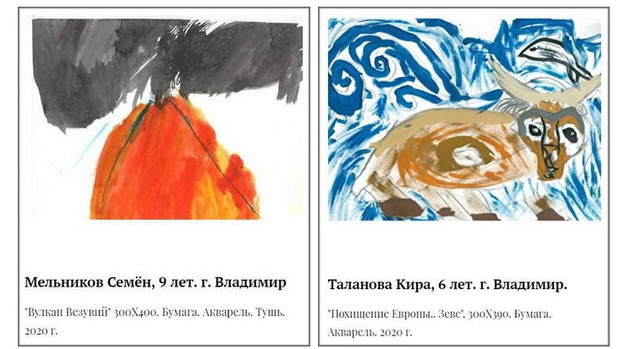 Как сообщает сайт ДД(ю)Т, сразу два воспитанника владимирской изостудии «Василиса» отмечены наградами: шестилетняя Кира Таланова и девятилетний Семен Мельников. Кира выполнила акварелью рисунок на тему «Похищение Европы… Зевс», а Семен нарисовал акварельными красками и тушью вулкан Везувий.