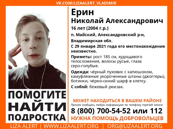 С 29 января 2021 года в Александровском районе Владимирской области разыскивается 16-летний юноша Николай Ерин. Ориентировки о его пропаже распространяет общественный поисково-спасательный отряд «ЛизаАлерт».