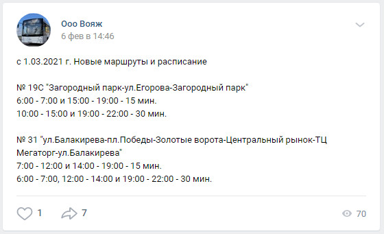 8 февраля в соцсетях появилась информация, что с 1 марта 2021 года во Владимире организуют новые автобусные маршруты. Претендентом на них якобы стала компания «Вояж», заявившая об этом публично на странице своего аккаунта в ВК. Однако вскоре мэрия поспешила опровергнуть эту информацию.