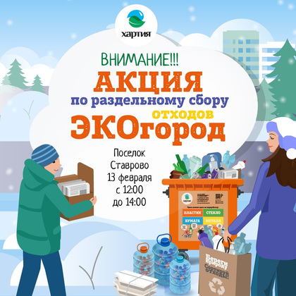 13 февраля на парковке перед ТЦ «Максим» региональный оператор «Хартия» проведет экологическую акцию по приему раздельно собранных отходов.