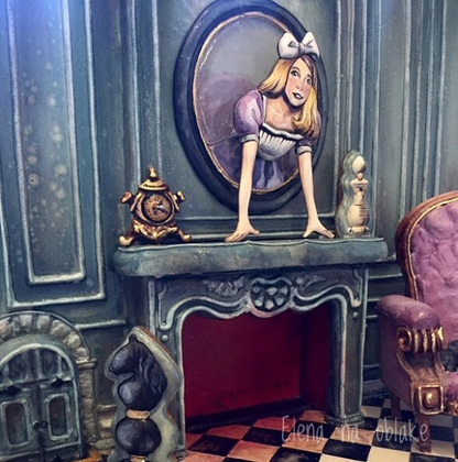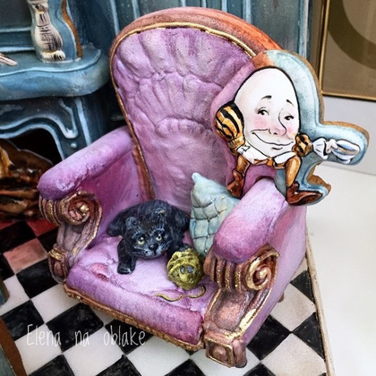 - Работая над этой композицией, главной моей задачей было сделать её интересной. Такой, которую хотелось бы рассматривать. Честно говоря, первая задумка с книгой была немного другая. Должен был быть и камин, и Алиса, но вот тайники я хотела сделать в полу, и спрятать там шахматы и нарисованную на вафельной бумаге шахматную доску. Но представляя готовую книгу, мне показалось интересным решением поставить объемное кресло и сделать тайники в камине и стене!