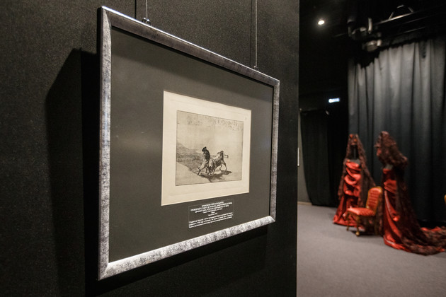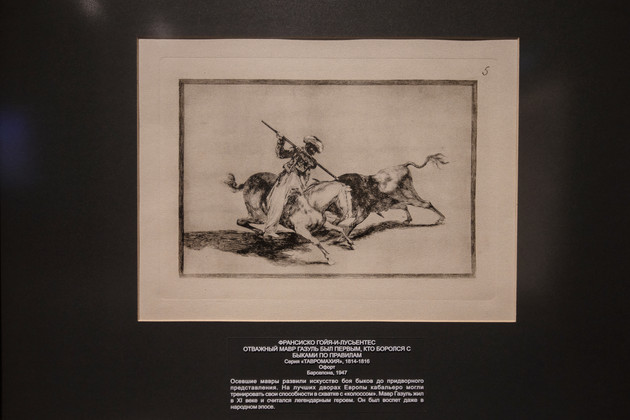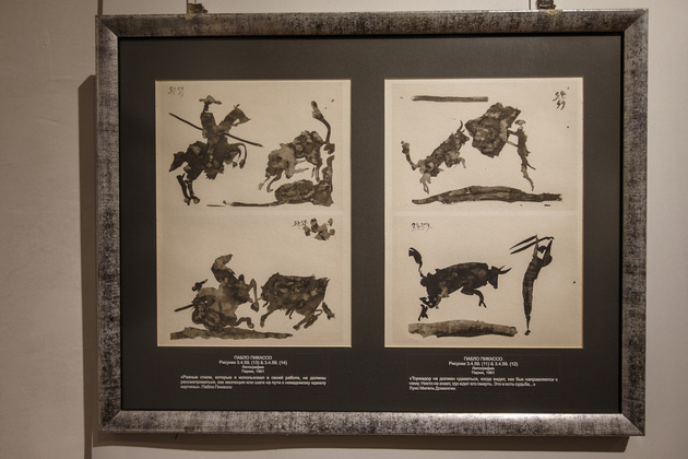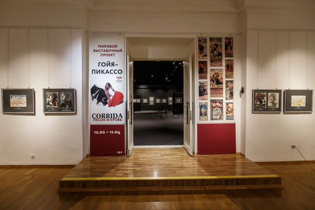 “Кровь и песок” - так называется выставочный проект, представленный в Палатах. В зале на третьем этаже комплекса все очень лаконично: на стенах - черно-белые литографии знаменитых художников, словно декорации к основному действу, которое должно происходить в самом центре зала.