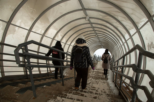 Сам надземный переход тоже вызывает недоумение. Лифта нет. Пандус с таким крутым уклоном, что спуститься по нему может только олимпийский чемпион по бобслею, а кто сможет подняться, вообще сложно представить. Но точно, не инвалид-колясочник. Да и мамочка детскую коляску никак не затолкает. Спрашивается, о людях дорожники думали, сооружая это недоразумение, или о «галочке»? О какой безопасности идет речь, если самые не защищенные и не маневренные граждане вынуждены переходить ставший еще более опасным перекресток по трассе?