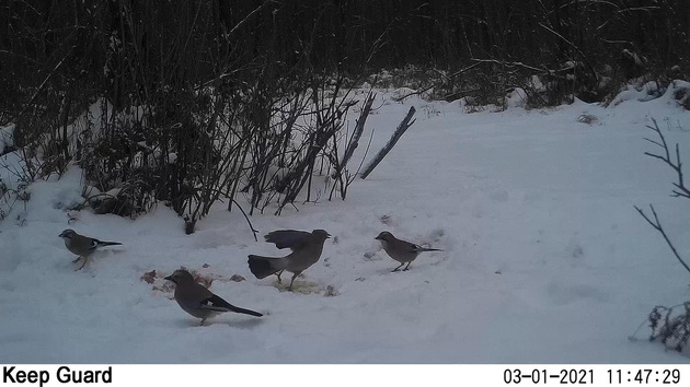 Украшением природы зимой являются оставшиеся зимовать птицы. Максим Сергеев рассказал, что за холодные месяцы встречал во Владимире несколько стай свиристелей по 100 птичек и более в каждой стае. Еще этой зимой специалисты Дирекции ООПТ наблюдали несколько видов птиц, которые обычно улетают на юг, а зимовать остаются очень редко. К примеру, в начале января у нас зимовал крапивник – маленькая коричневая в крапинку птичка с задранным кверху хвостиком. Из обычных лесных птиц на фотоловушки в Клязьминско-Лухском заказнике попались сойки, которые тоже прилетели клевать угощения, выложенные для хищных зверей.